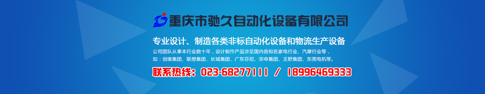 重慶市馳久自動(dòng)化設(shè)備有限公司是一家專業(yè)設(shè)計(jì)、制造各類非標(biāo)自動(dòng)化設(shè)備和物流生產(chǎn)設(shè)備的綜合性企業(yè)。 公司以“馳而不息,久而彌篤”為發(fā)展理念,堅(jiān)持“憑誠信獲市場(chǎng),靠質(zhì)量得效益”的企業(yè)宗旨,不斷創(chuàng)新理念,持續(xù)發(fā)展技術(shù),為客戶提供滿意的自動(dòng)化物流系統(tǒng)解決方案和非標(biāo)自動(dòng)化設(shè)備。 公司生產(chǎn)基地坐落在重慶市北碚區(qū)歇馬鎮(zhèn)天馬村,占地面積約5000平方米。公司擁有先進(jìn)的加工設(shè)備,配套激光切割機(jī)、數(shù)控剪板機(jī)和折彎機(jī)等;同時(shí)擁有自動(dòng)涂裝生產(chǎn)線。 公司團(tuán)隊(duì)從事本行業(yè)數(shù)十年,設(shè)計(jì)制作產(chǎn)品涉足國內(nèi)各知名家電行業(yè)、汽摩行業(yè)等,如:創(chuàng)維集團(tuán)、聯(lián)想集團(tuán)、長城集團(tuán)、廣東芬尼、宗申集團(tuán)、王野集團(tuán)、東莞電機(jī)等。 [ 了解更多 ]